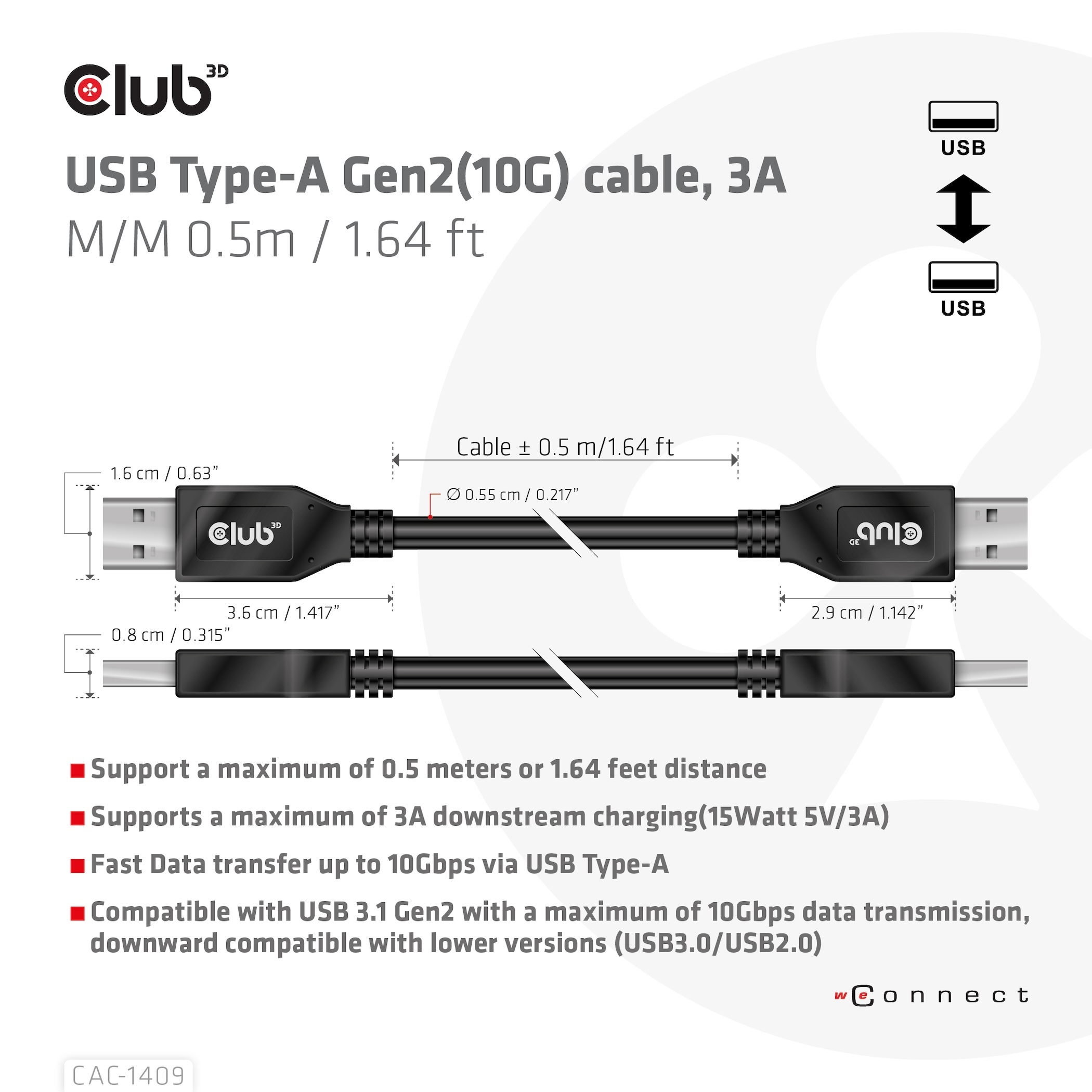 CLUB3D USB Type-A Gen2(10G) cable, 3A M/M 0.5m / 1.64 ft, 0,5 m, USB A, USB A, USB 3.2 Gen 2 (3.1 Gen 2), 10 Gbit/s, Zwart