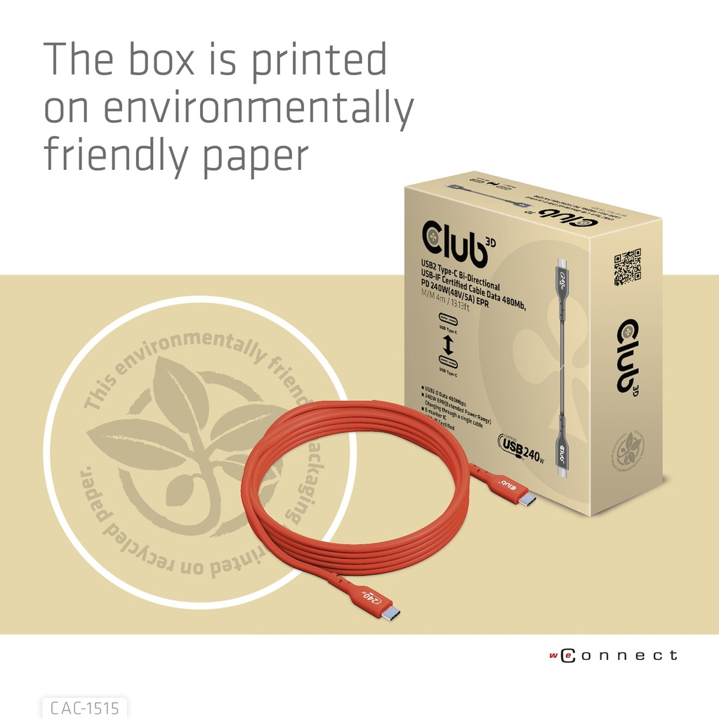 CLUB3D USB2 Type-C Bi-Directional USB-IF Certified Cable Data 480Mb, PD 240W(48V/5A) EPR M/M 4m / 13.13ft, 4 m, USB C, USB C, USB 2.0, Oranje