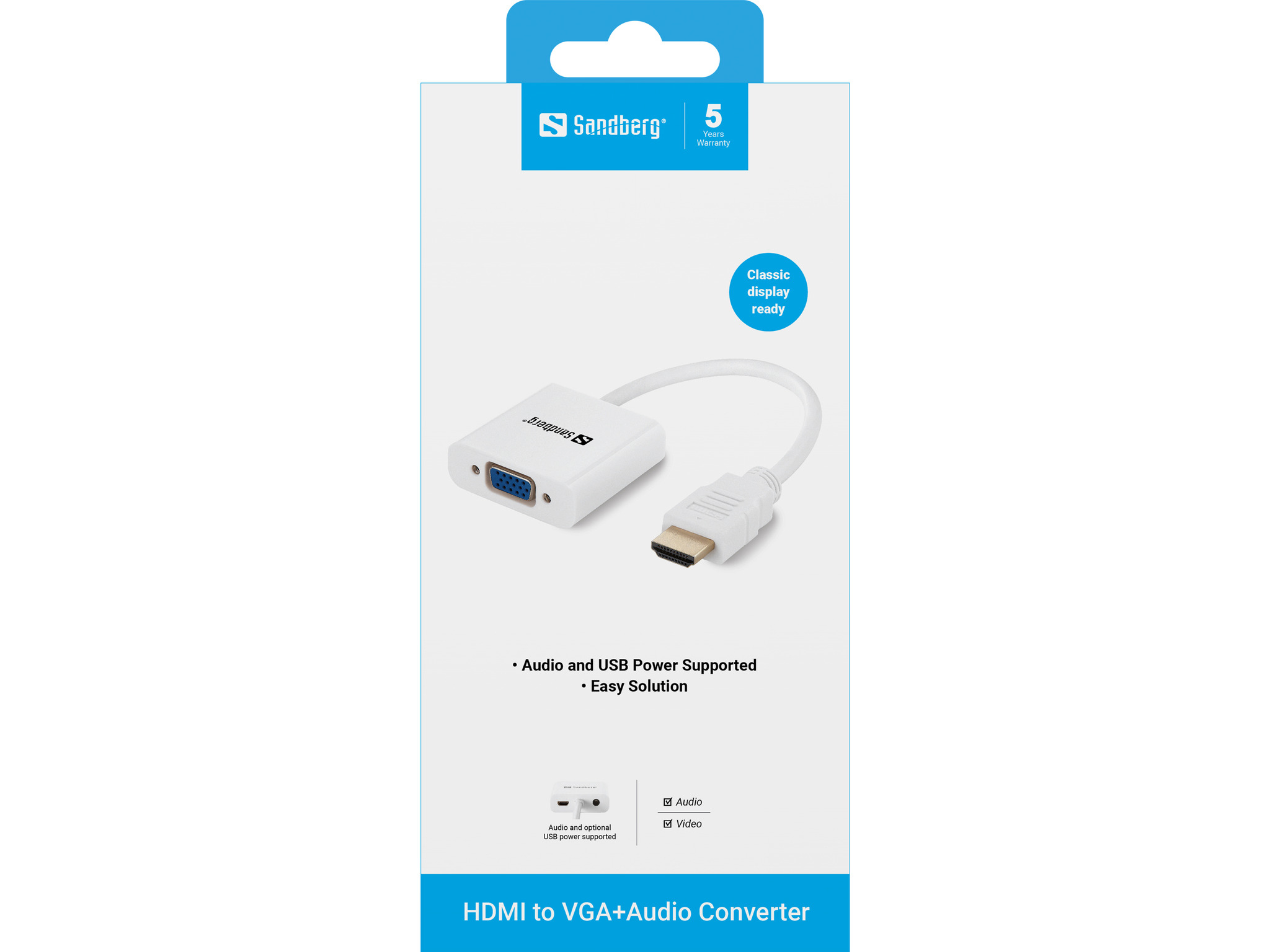 Sandberg HDMI to VGA+Audio Converter, HDMI Type A (Standaard), VGA (D-Sub) + 3.5mm, Mannelijk, Vrouwelijk, Wit, RoHS