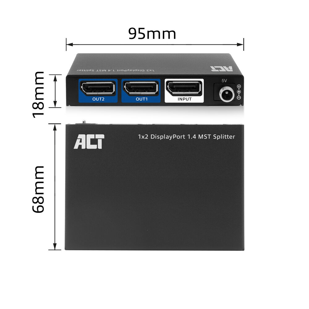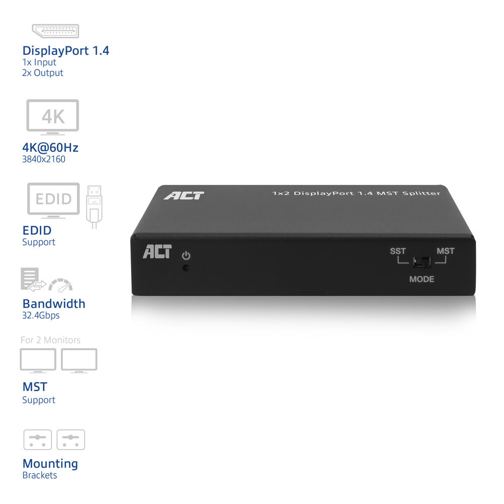 ACT 1x2 DisplayPort 1.4 MST Splitter, DisplayPort, 2x DisplayPort, 7680 x 4320 Pixels, Zwart, 8K Ultra HD, 60 Hz