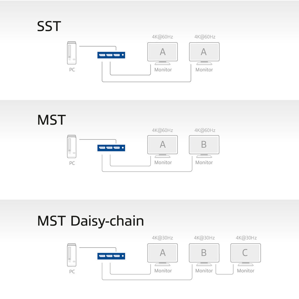 De AC7720 ondersteunt zowel SST (Single Stream Transport) en MST (Multi Stream Transport). Gebruik SST om de content te spiegelen op beide schermen (tot 8K@30Hz). Schakel naar MST om het bureaublad uit te breiden naar twee schermen (tot 4K@60Hz per monitor, afhankelijk van de totale bandbreedte en de broneigenschappen).