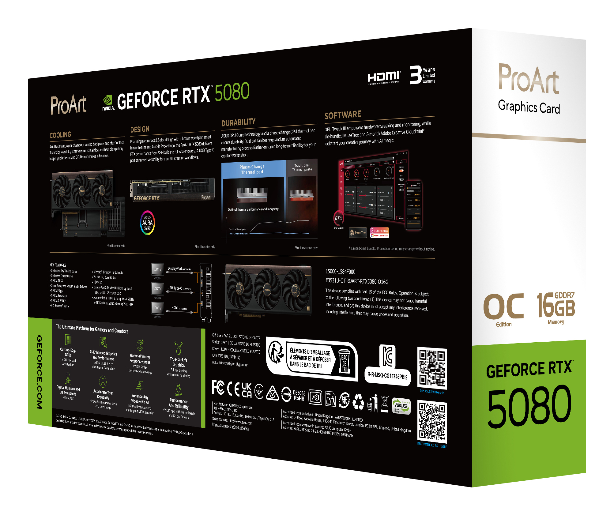ASUS ProArt -RTX5080-O16G. Grafische processor familie: NVIDIA, Grafische processor: GeForce RTX 5080. Grafische geheugen: 16 GB, Grafische adapter, soort geheugen: GDDR7, Geheugenbus: 256 Bit. Maximum resolutie: 7680 x 4320 Pixels. DirectX versie: 12 Ultimate, OpenGL versie: 4.6. Soort aansluiting: PCI Express 5.0. Type koeling: Actief, Aantal ventilatoren: 3 ventilator(en), Kleur van de verlichting: Multi