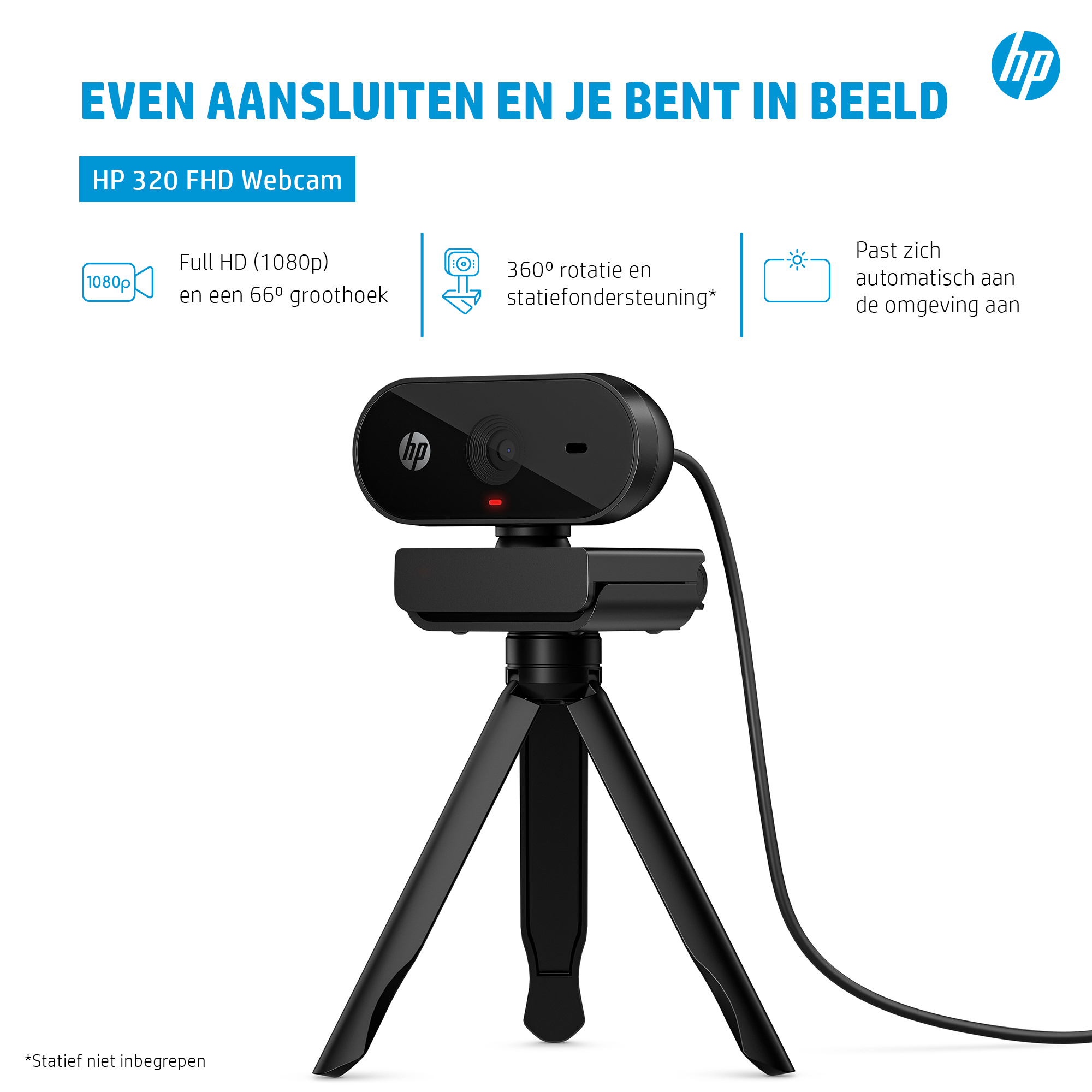 HP 320 FHD-webcam, 1920 x 1080 Pixels, Full HD, 30 fps, Thuis, USB, Zwart