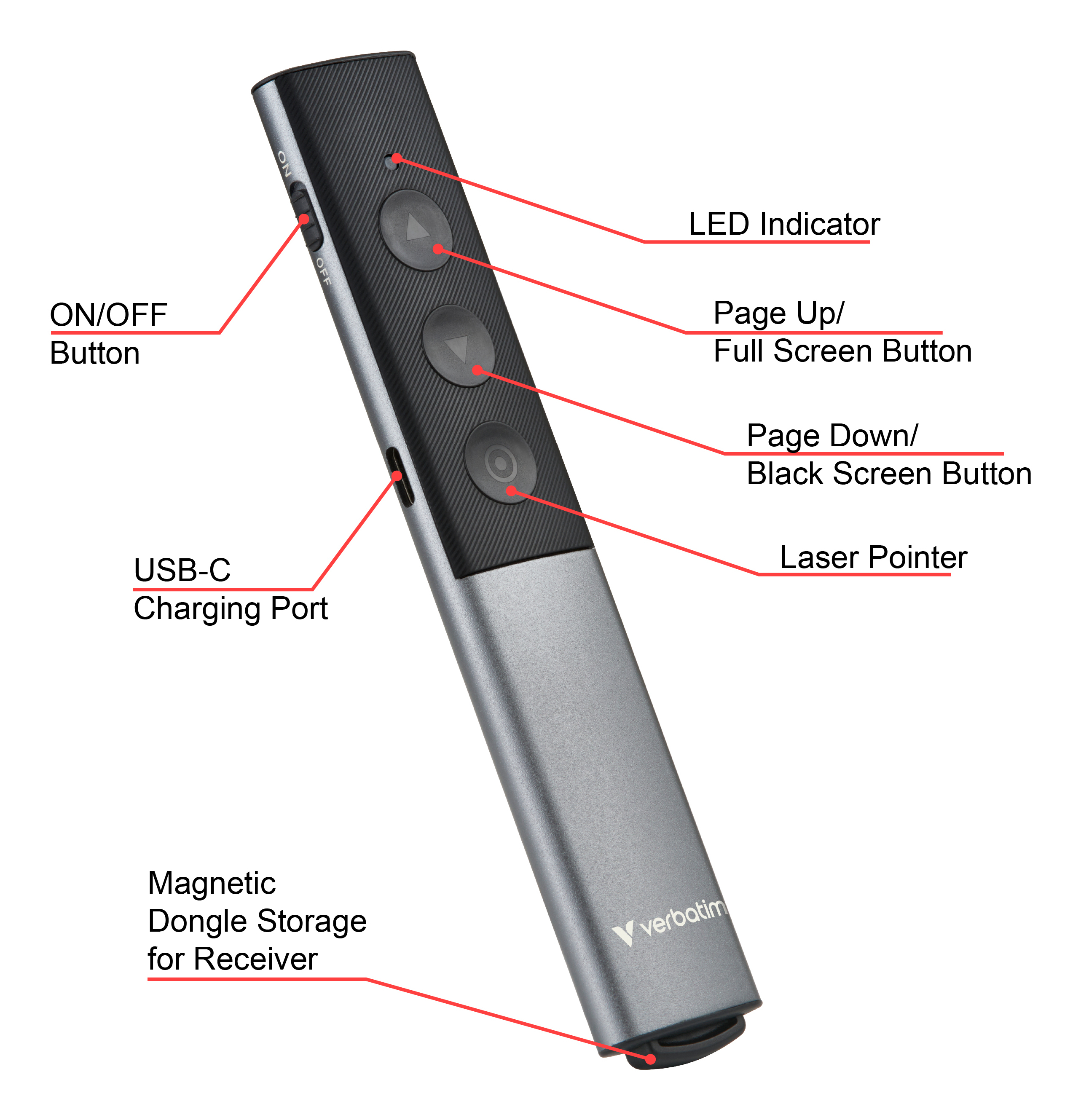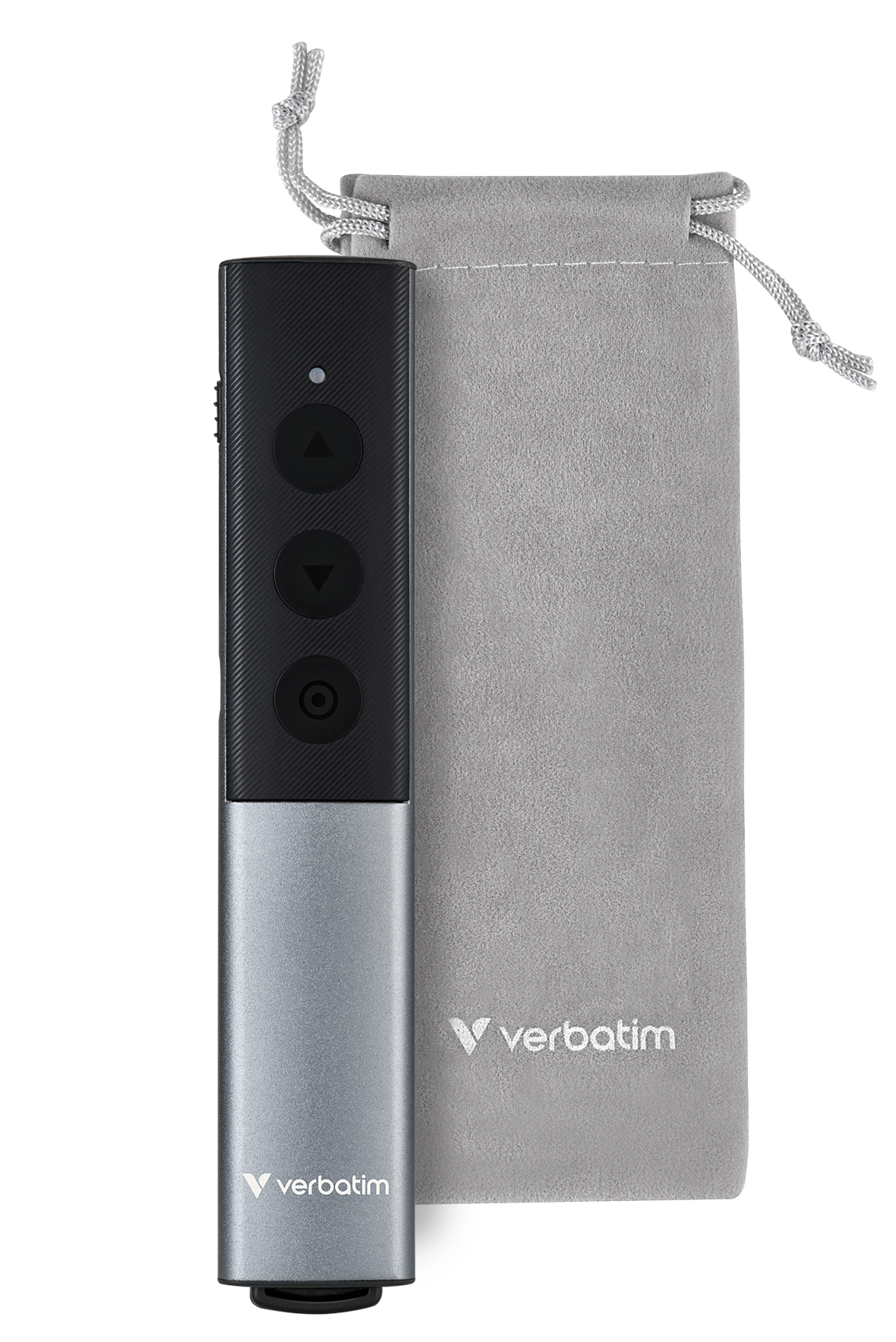 De Verbatim Agenda Wireless Presenter geeft je volledige controle over je presentatie, of je nu in de directiekamer, het klaslokaal of online bent. Met intuïtieve dianavigatie, schermomschakeling en een rode laseraanwijzer die tot 100 meter zichtbaar is, blijft je boodschap helder en professioneel. Ontworpen voor eenvoud en werkt direct uit de doos - sluit gewoon de USB-ontvanger aan en begin met presenteren. Geen software, geen gedoe, gewoon prestaties waarop je kunt vertrouwen.